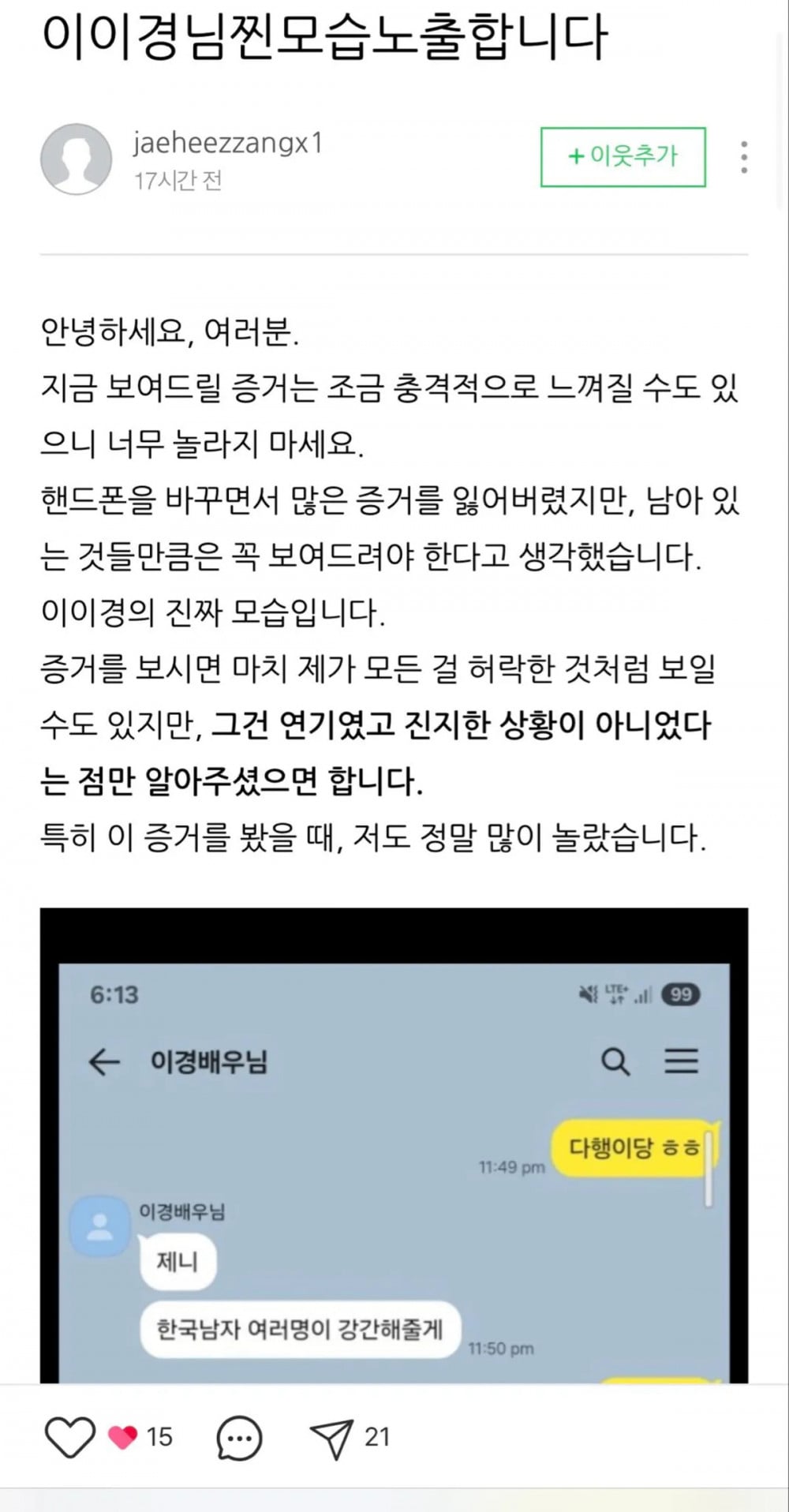 On October 20, A posted an entry on her Naver blog titled 'Revealing the True Face of Lee Yi Kyung.' The post included screenshots of KakaoTalk and Instagram messages allegedly with the actor. The screenshots contained requests for explicit photos, profanity, sexually inappropriate comments, and photos appearing to show Lee on set and in selfies.