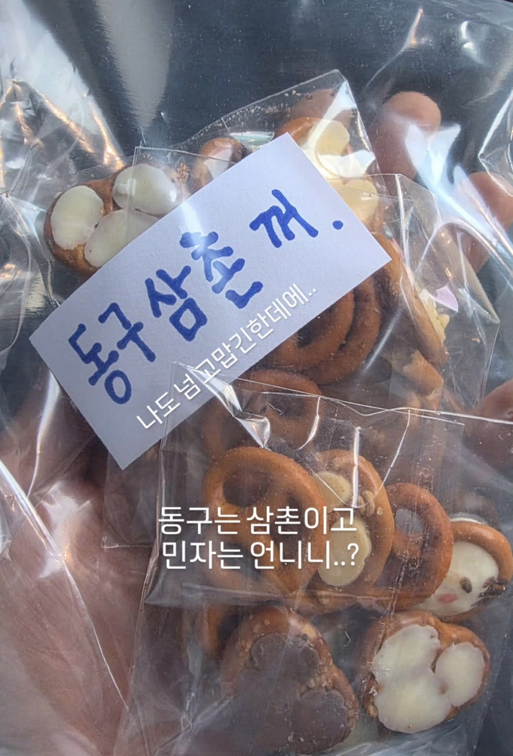 The photo shows pretzels and other snacks seemingly gifted by the Slow and Intense makeup team. A label attached to the snack reads, “For Uncle Dong-gu.”