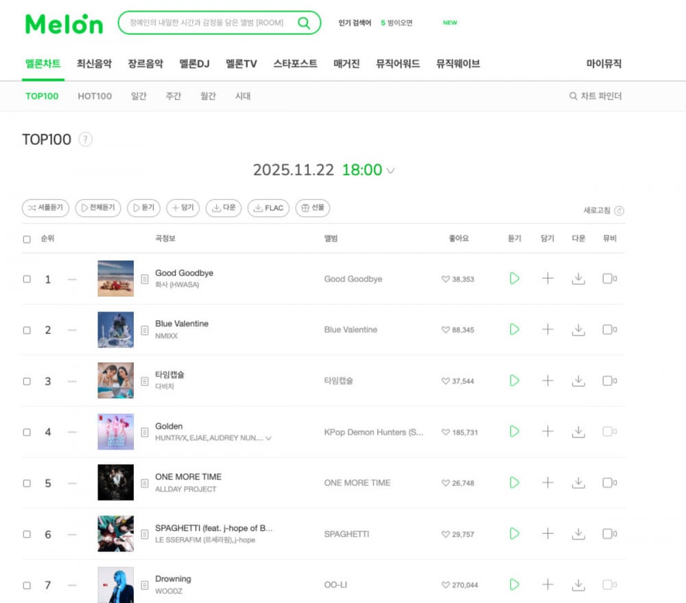 On November 22 KST, Hwa Sa’s ‘Good Goodbye’ rose to No. 1 on several major online music charts, including Melon TOP100, Bugs, and Flo. The track was released a month earlier, and Hwa Sa had already finished all broadcast promotions for it.
