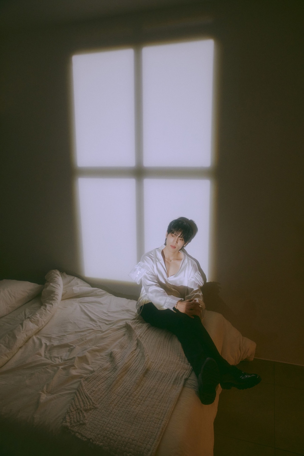 In the photos, Jang Dongwoo is bathed in soft light streaming through a window in a dimly lit room. With his natural hairstyle and a flowing white shirt, he exudes effortless sensuality and sophisticated masculinity, captivating global fans with his intense allure.