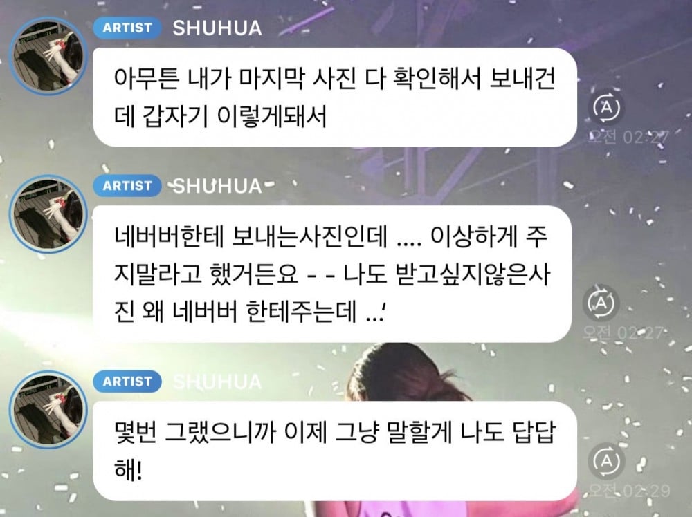 In a series of messages, Shuhua wrote: "They are photos being sent to Neverland... I told the staff not to make them all weird -_- These are photos that I don't even want, so why give them to Neverland...? This has happened many times, so I am just going to say it. I am so done with this!"