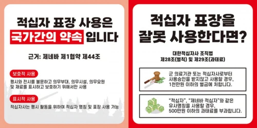 Under the law, the Red Cross emblem can only be used with official approval from military authorities (for protective use) or the Korean Red Cross (for indicative use). The symbol denotes that its users or facilities are protected from attack during wartime, and misuse could erode this vital protection.