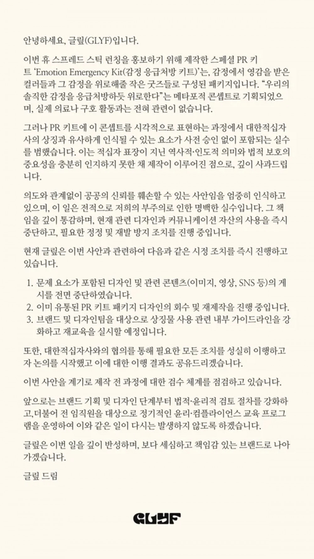 On November 6, GLYF released a statement through its official social media channels, acknowledging the mistake:“In the process of visually expressing our special PR kit, ‘Emotional First Aid Kit’, designed to promote the launch of our new Hugh Spread Stick, we made an error by including elements that could be perceived as similar to the emblem of the Korean Red Cross.”