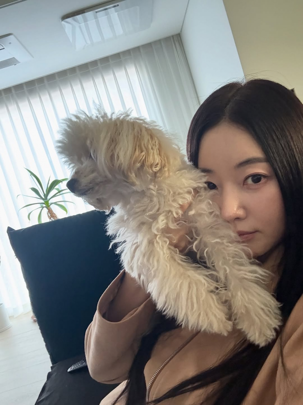 In the photos, Kim Sa Rang is seen holding her dog at home, enjoying a relaxed moment. Her expression, as she poses for the camera while cradling her pet with one arm, radiates warmth and ease.