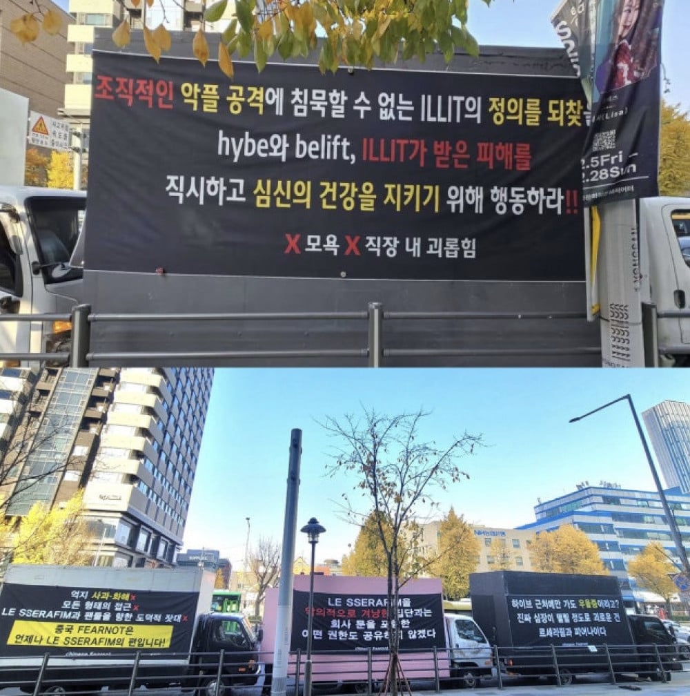 On November 20, fans gathered in front of HYBE’s headquarters in Yongsan-gu, Seoul, displaying trucks with messages calling for protection of their favorite groups and action against online harassment.