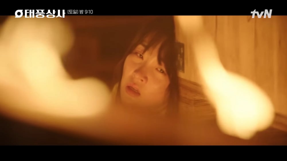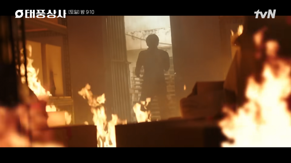 While checking inventory alone in the warehouse, Mi Sun was caught in a sudden fire. Attempting to protect the goods, she collapsed. Spotting her through the flames, Tae Poong didn’t hesitate. He pushed aside scorching metal debris and plunged into the inferno to rescue her.