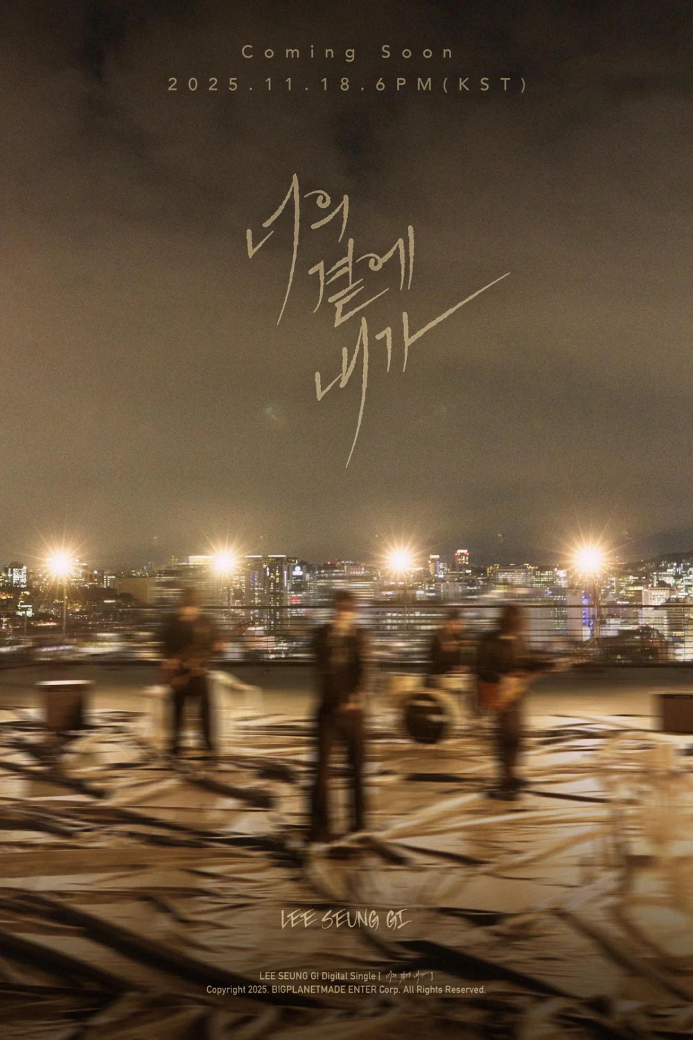 The poster reveals that Lee Seung Gi’s digital single, 'By Your Side,' will be released on November 18 at 6 PM. Captured against the backdrop of a cityscape illuminated by dazzling lights, the poster shows Lee Seung Gi and his band in a slightly blurred, atmospheric image, heightening anticipation for the new release.