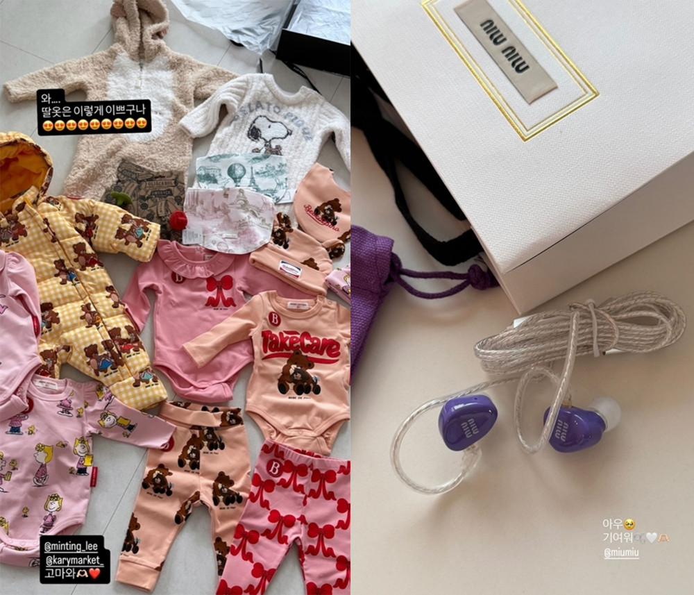 Another photo featured custom luxury earphones from a fashion brand. With the caption “Oh, so cute,” she showed off a pair marked with the Miu Miu logo, drawing attention once again. Some fans reacted warmly, commenting, “Her fashion sense is still intact, even while raising a newborn,” and “You can tell she’s a trendy mom just from the gifts.”