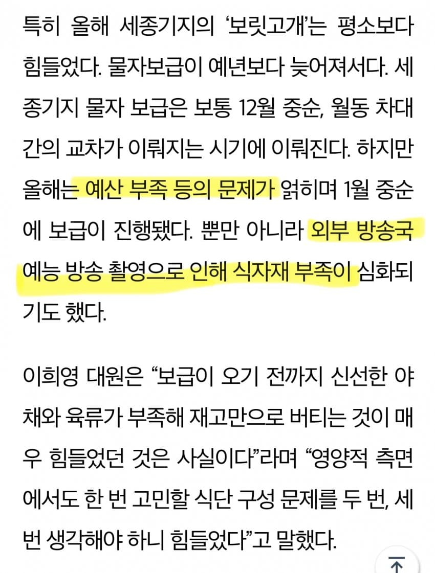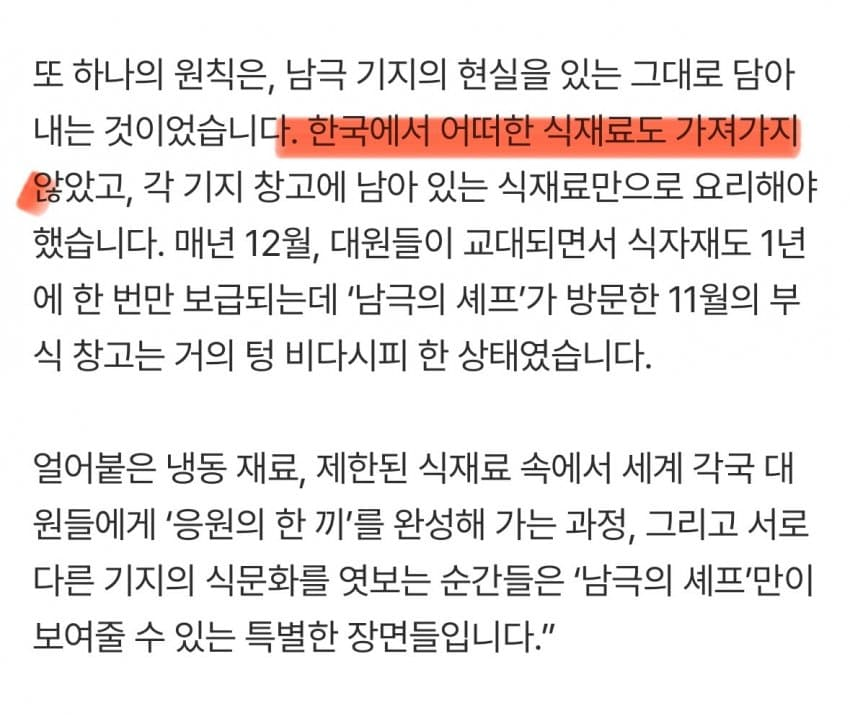 In other words, MBC’s production of 'Chef in Antarctica' exacerbated an already difficult situation for personnel dealing with nutritional shortages. With over 30 additional people staying for an extended period, the extra consumption would have been substantial.