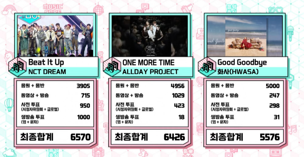 NCT Dream won the trophy over strong contenders, including ALLDAY PROJECT and Hwa Sa. Their new single "Beat It Up" earned an impressive 1,000 points in the live-broadcast voting segment, finishing with a total score of 6,570 points.