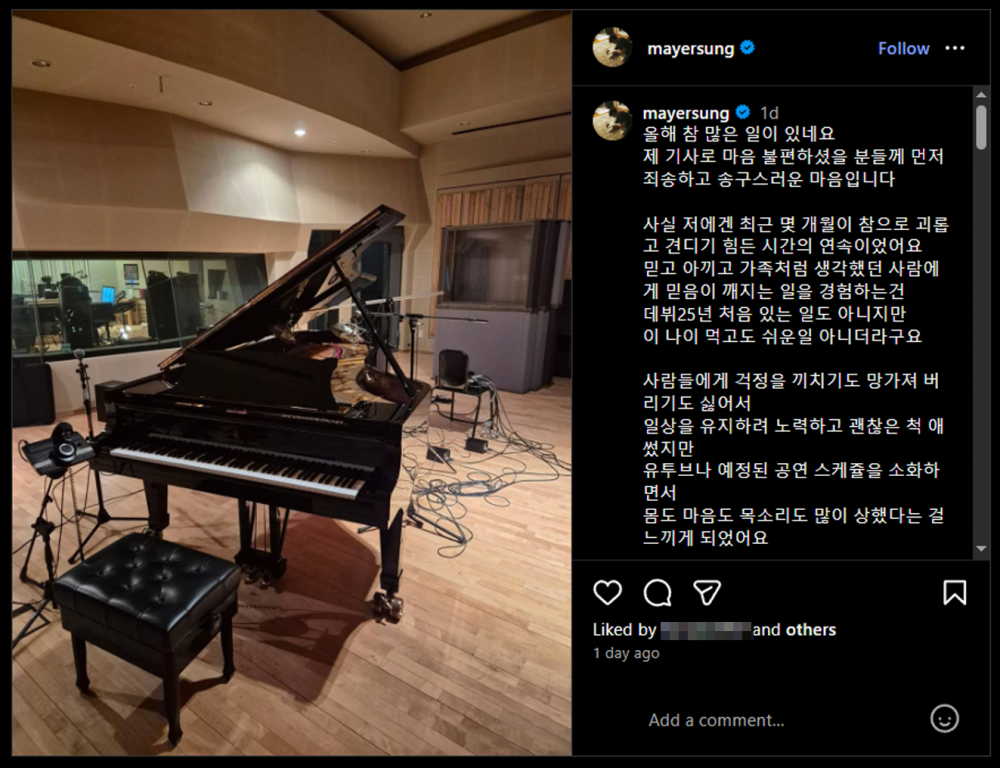 He continued, "I apologize for the delay in announcing the year-end concert. Honestly, I’ve been questioning whether I can even stand on stage in this situation. I want to reach a point where I can confidently say I’m okay, both mentally and physically. I’ll make a decision and post an update within this week."