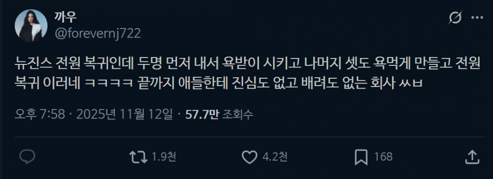 "All of the NewJeans members intended to return, but ADOR chose to bring out only 2 first so they would get cursed at for returning, and the other 3 would get cursed at for not returning. Only after that did they choose to announce that all 5 would return. This company has no sincerity or consideration for these girls"