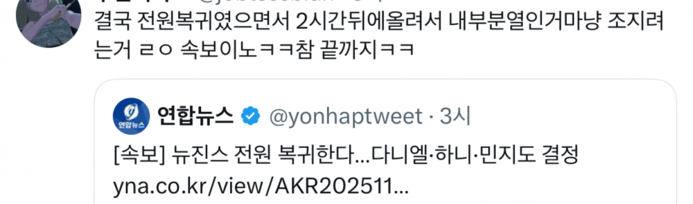"In the end, it was a full group return, but ADOR tried to make it look like there was internal division first by waiting 2 hours to announce the return of the other 3. It's really obvious"