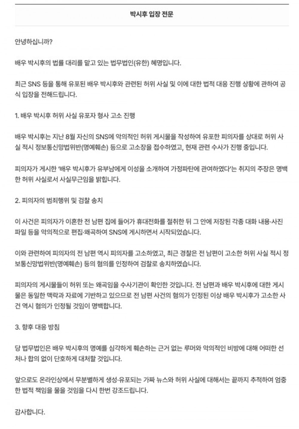 According to Park’s legal team, “The incident began when the suspect entered her divorced former husband’s home, stole his mobile phone, and maliciously edited and distorted various stored conversations and photo files before posting them on social media. The suspect’s former husband also filed a complaint, and the police recently acknowledged the charges of defamation through false information under the Information and Communications Network Act and forwarded the case to the prosecution.”