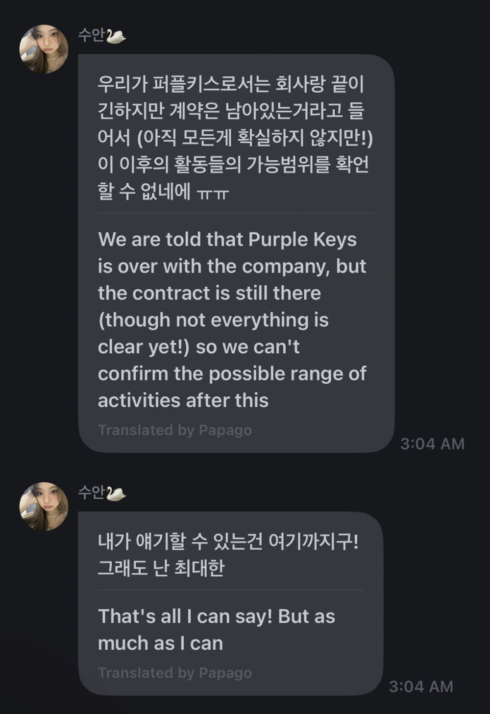 However, even more surprising news has come out. On November 8, PURPLE KISS's Swan revealed that the members would not be free to pursue their own solo career endeavors in the future, as previously thought. She explained that despite PURPLE KISS being disbanded early, the members' individual contracts with RBW Entertainment are still active until March 2028 - tying the members to the company for the next 3 years even with no activities planned for them. Swan expressed her confusion over the situation.