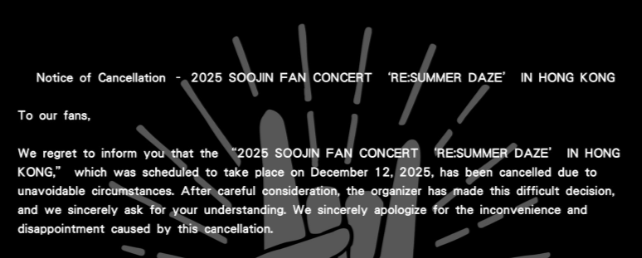 Following that, Soojin's upcoming concert in Hong Kong on December 12 was cancelled as well, due to "unavoidable circumstances."