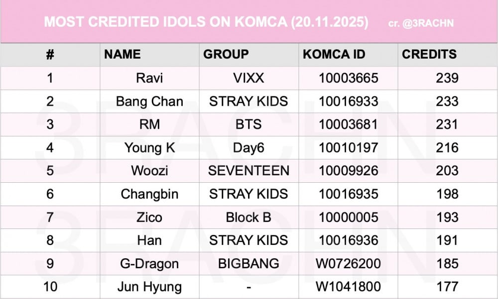 This puts Stray Kids in the rare position of having three members simultaneously ranked among the most-credited idols in the entire industry, in addition to being the only 4th-generation idols on the list, underscoring their reputation as a true self-producing group since their 2018 debut.