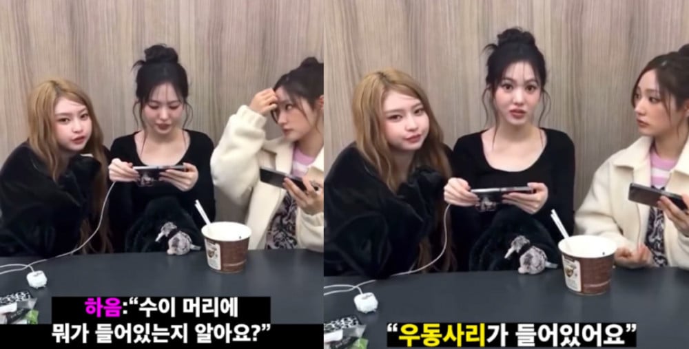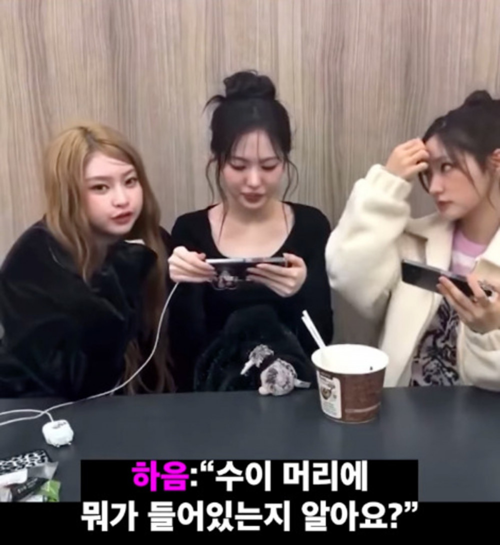 During a recent livestream held to communicate with fans, the members chatted casually about their trainee days. When Jiyu mentioned, "This is the udon we used to eat a lot as trainees," Haum suddenly turned to Sui and said, "Do you know what is inside Sui's head? Udon noodles."