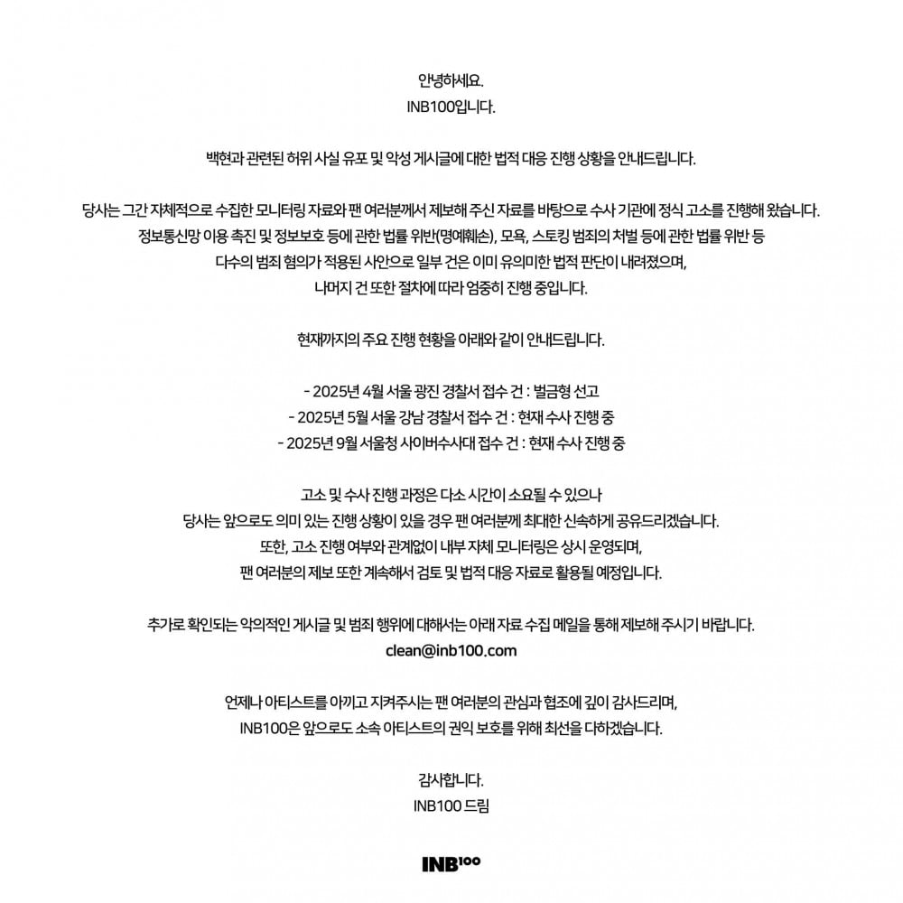 On December 18, Baekhyun’s agency INB100 released an official statement updating fans on the status of its ongoing legal actions. “We would like to inform you of the progress regarding our legal response to the spread of false information and malicious posts related to Baekhyun,” the agency said, adding that “meaningful legal judgments have already been made in some cases.”