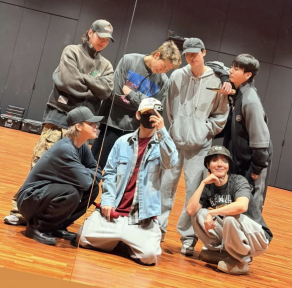On December 12, V shared a mirror selfie taken inside a practice room, capturing RM, Jin, SUGA, j-hope, Jimin, V, and Jungkook reunited as a complete group. The photo, taken by V himself using the mirror, offers fans a candid glimpse of the members ahead of their next chapter.