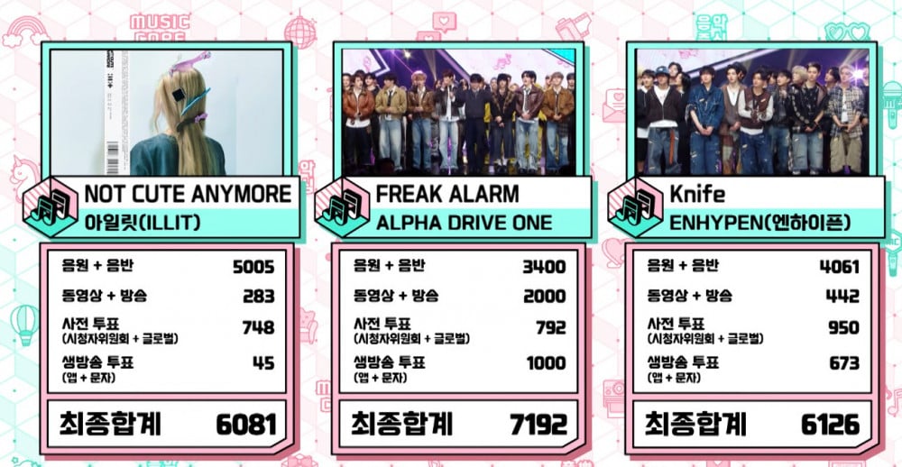 The nominees for first place this week included ILLIT’s “NOT CUTE ANYMORE,” which earned 6,081 points, ALPHA DRIVE ONE’s “FREAK ALARM” with 7,192 points, and ENHYPEN’s “Knife,” which placed third with 6,126 points. After combining the real-time text voting results, ALPHA DRIVE ONE ultimately secured first place with “FREAK ALARM.”