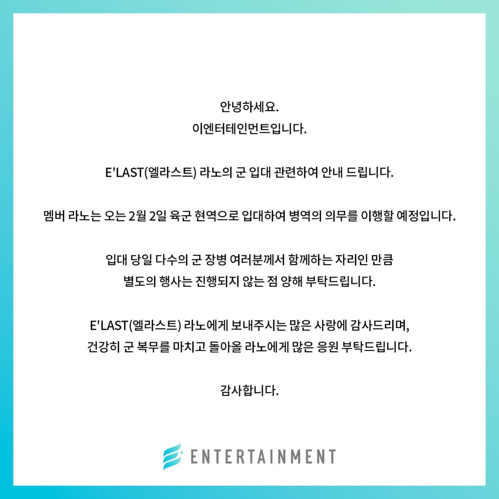 On January 5, E’LAST released a statement via social media announcing that member Rano is scheduled to enlist on February 2. He will be fulfilling his mandatory military service as an active-duty soldier.