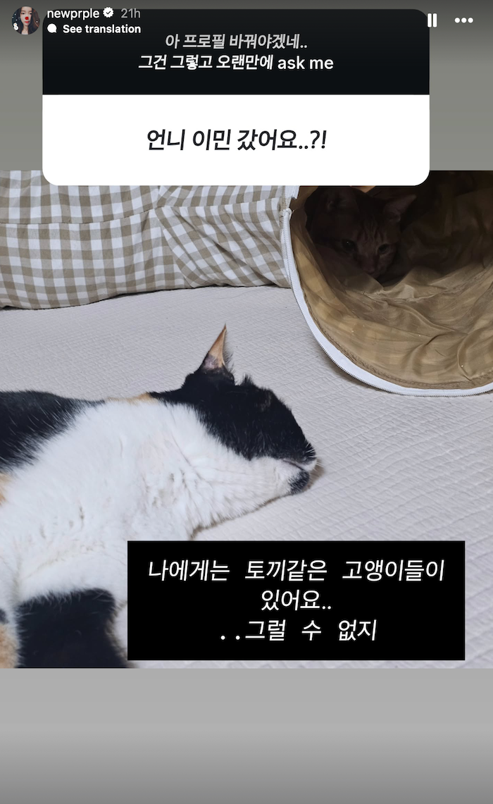 On January 28 KST, Hana chatted with her followers via "Ask Me Anything" on Instagram. One follower asked, "Did you move overseas?", to which Hana replied, "I have cats who are like rabbits, so I can't do that."
