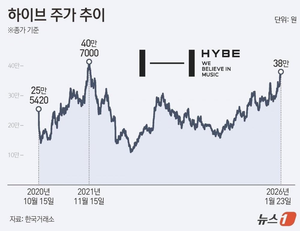 According to the Korea Exchange on January 24, industry heavyweight HYBE closed at 380,000 KRW (approximately 263 USD), up 3.12 percent from the previous trading day. The rise was driven by expectations surrounding the return of key artists, including BTS, as well as positive evaluations of newly debuted groups successfully establishing themselves in the market.