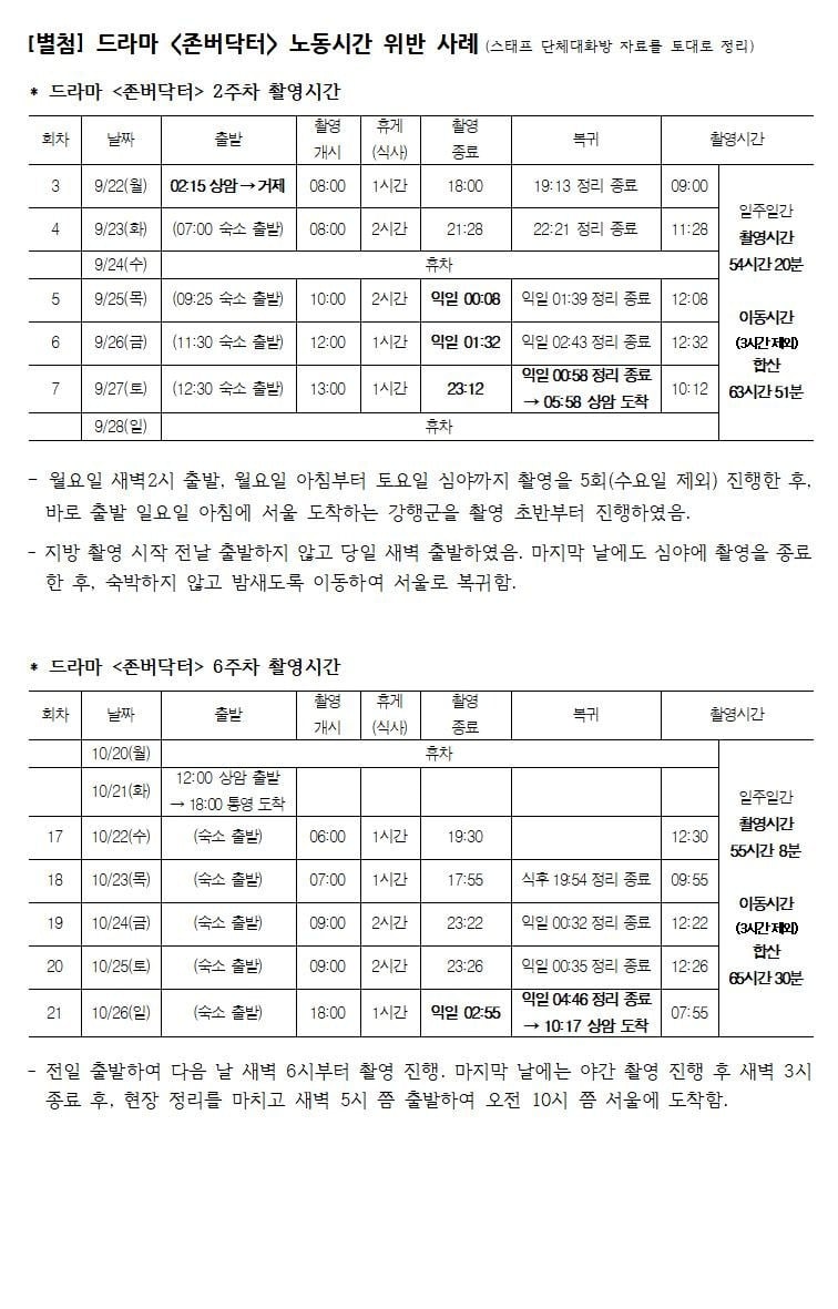 The center added, “When long-distance travel of more than three hours round trip is taken into account, seven out of the 15 weeks constitute violations.” It further criticized the production company, stating, “Although the company responded that it had obtained consent forms for 65-hour workweeks from all staff members, written consent does not negate the fact that this constitutes a clear violation of the Labor Standards Act.”