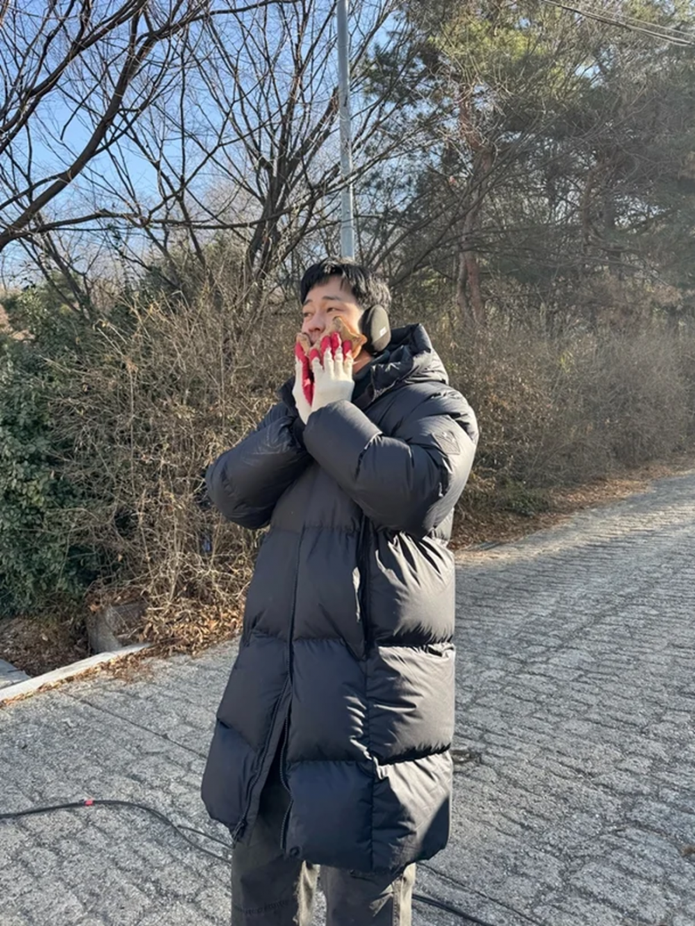 Wearing thick earmuffs and knit gloves, So Ji Sub presses hot packs against his cheeks to keep warm. The photos are believed to have been taken on the set of upcoming drama 'Manager Kim'.