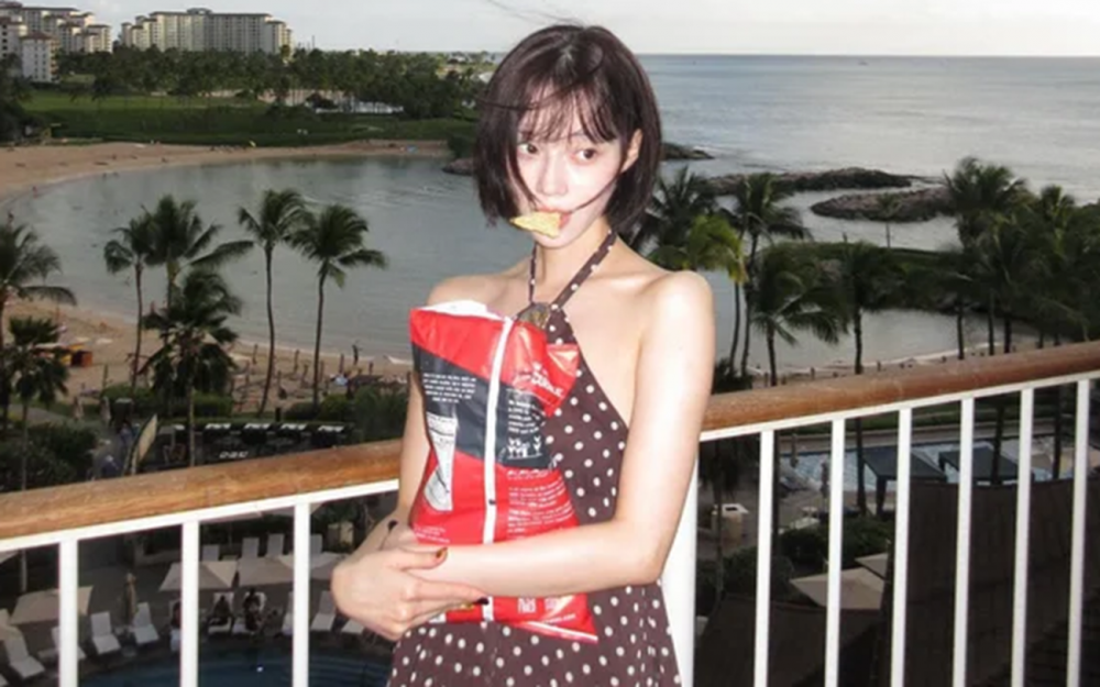 Sporting her signature short haircut, Winter pulled off a dotted halter-neck dress with ease, highlighting her slender figure and soft, youthful charm. Holding a snack bag nearly her size, she added a playful and endearing touch to the relaxed snapshots.