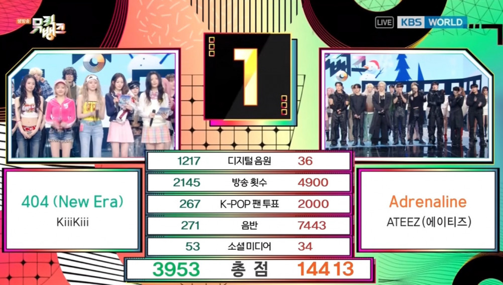 On this episode, the nominees for first place were KiiiKiii with “404 (New Era)” and ATEEZ with “Adrenaline.” In the end, ATEEZ claimed the win with a total score of 14,413 points, while KiiiKiii followed in second place with 3,953 points.