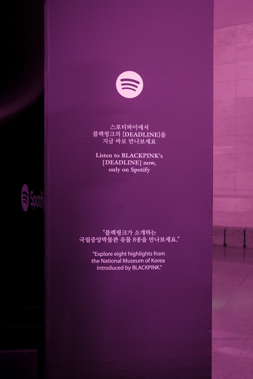 Just as previously announced, BLACKPINK has partnered with the National Museum of Korea and Spotify to bring a special event from February 26 to March 8. During the project period, a lighting event illuminates the exterior of the National Museum of Korea in pink, symbolizing BLACKPINK and the collaboration. The interior of the museum is also tinged with pink and adorned with BLACKPINK logos, with a short description of the 'DEADLINE' project event. The members also participate as audio docents for eight representative artifacts, guiding visitors through Korean cultural heritage.