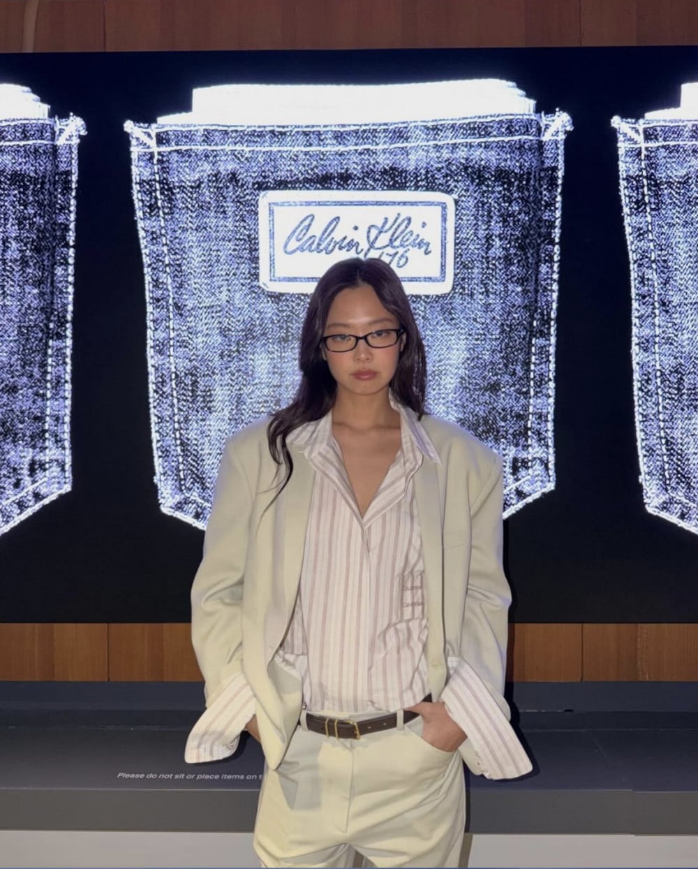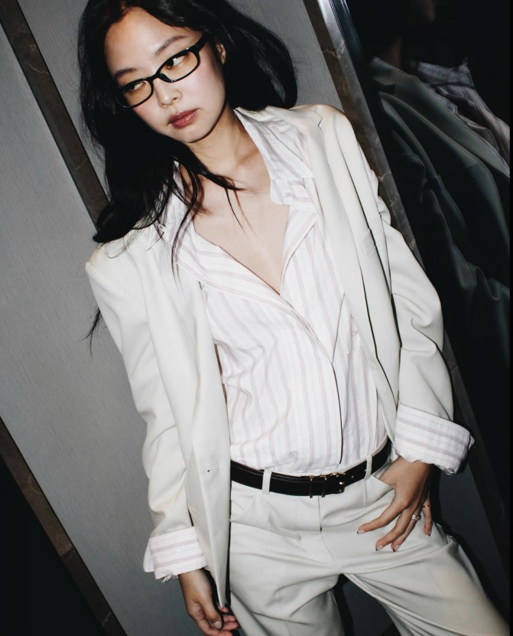 For the event, Jennie opted for an ivory suit set with a subtle green tint, paired with a striped shirt. She completed the ensemble with a brown belt, killer heels, and black horn-rimmed glasses, highlighting a restrained yet polished elegance. The collection showcased at the show was led by creative director Veronica Leoni, featuring sharp tailoring defined by clean, straight lines. Blazers with broad shoulder lines and bold sleeveless suits stood out, emphasizing strong silhouettes.