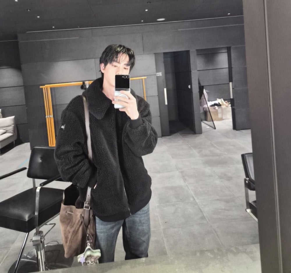 On February 14th KST, Jin shared a post on the fan community Weverse with the caption “Off work~~” along with a photo. In the mirror selfie, taken with a Samsung Galaxy Flip, Jin drew admiration for his striking visuals — partially revealed black hair, sharp brows, large expressive eyes, a high bridged nose, and a defined jawline — earning praise as a “god of beauty.”