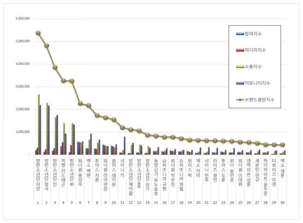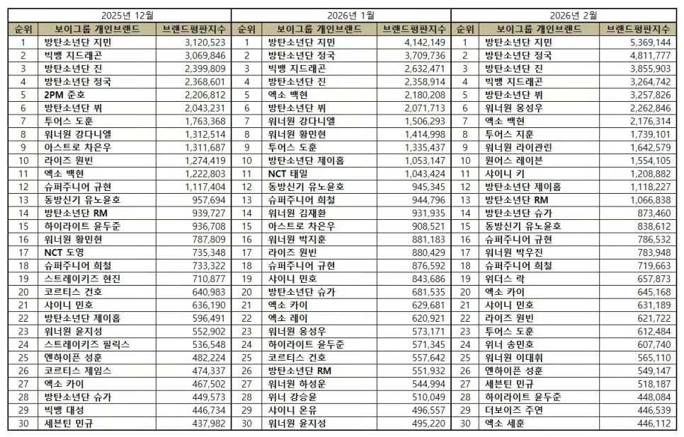 From January 14 through February 14 KST, the Korea Brand Reputation Index analyzed big data of 755 individual male K-Pop idols in areas including consumer participation, media activity, communication, and community activity. Based on the analysis results, Jimin ranked in 1st place for the third consecutive month, earning 5,369,144 brand points total for this month. Jungkook took up 2nd place for the second consecutive month with 4,811,777 brand points, followed by Jin in 3rd place with 3,855,903 brand points.