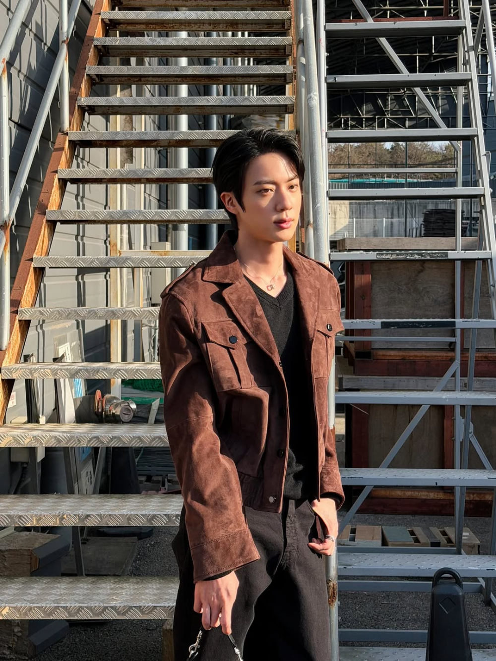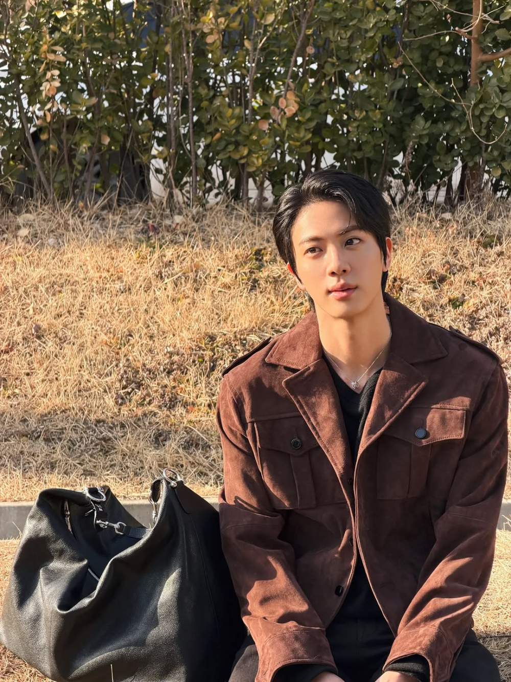 Jin posed in the sun in a refreshing outdoors setting, creating an elegant look with his dark brown coat and neatly styled hair.