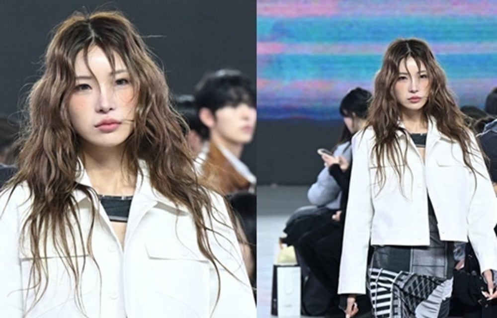 Choi walked the runway for the Phenomenon Seeper collection, showcasing a bold look that combined a white cropped jacket, a patchwork-style long dress, and black combat boots. Her long, wavy hairstyle added a free-spirited touch.