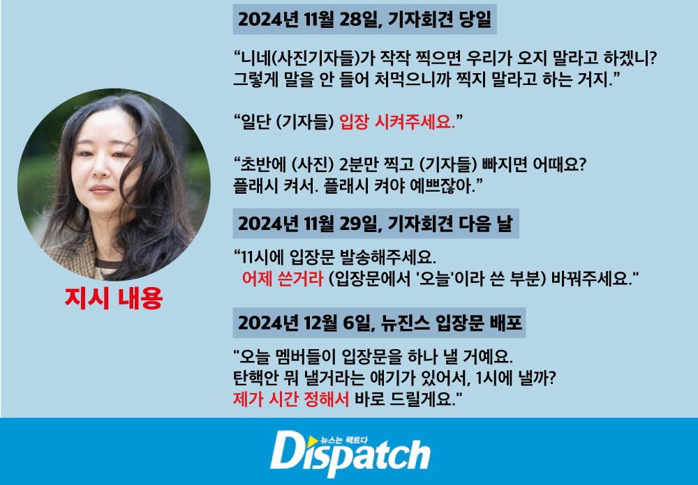 The outlet claims to have secured evidence that Min Hee Jin directed the event behind the scenes, wrote the script, briefed the members, and oversaw the rebuttal press materials, including timing and distribution.