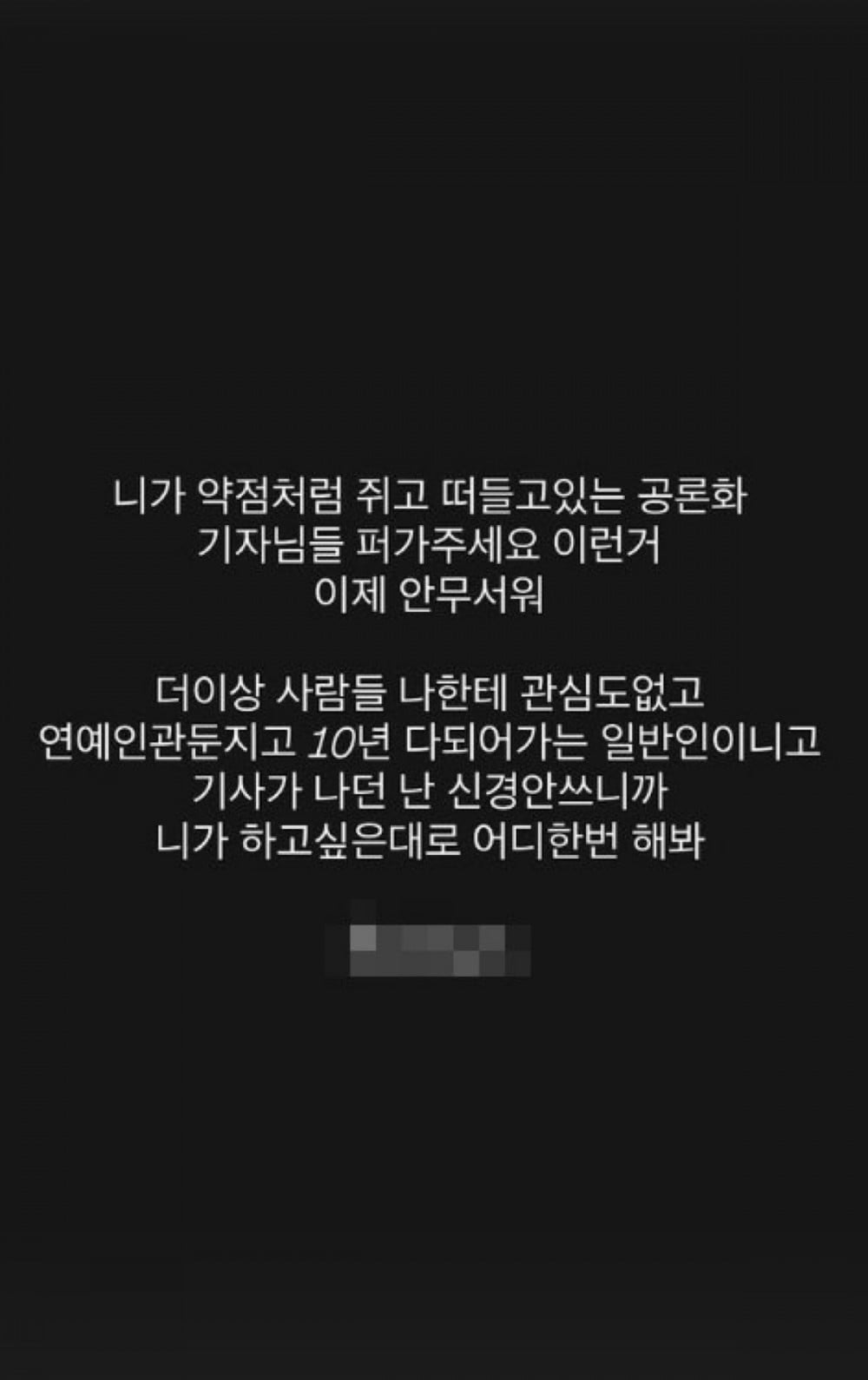 He continued, "I am no longer afraid of public scrutiny. I am a private citizen who stopped celebrity activities nearly 10 years ago," adding, "Do whatever you want." However, he did not provide direct explanations regarding the specific allegations raised by A.
