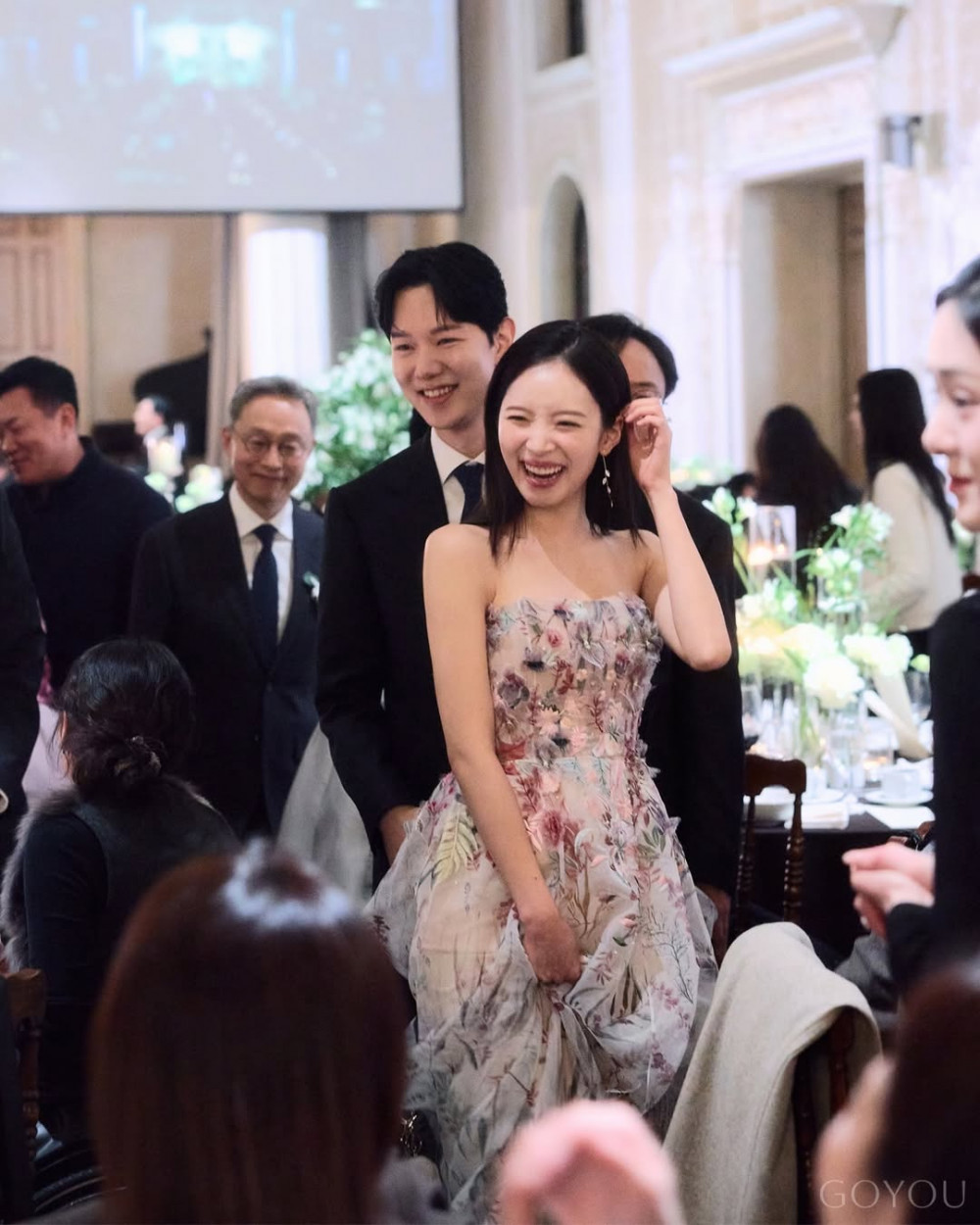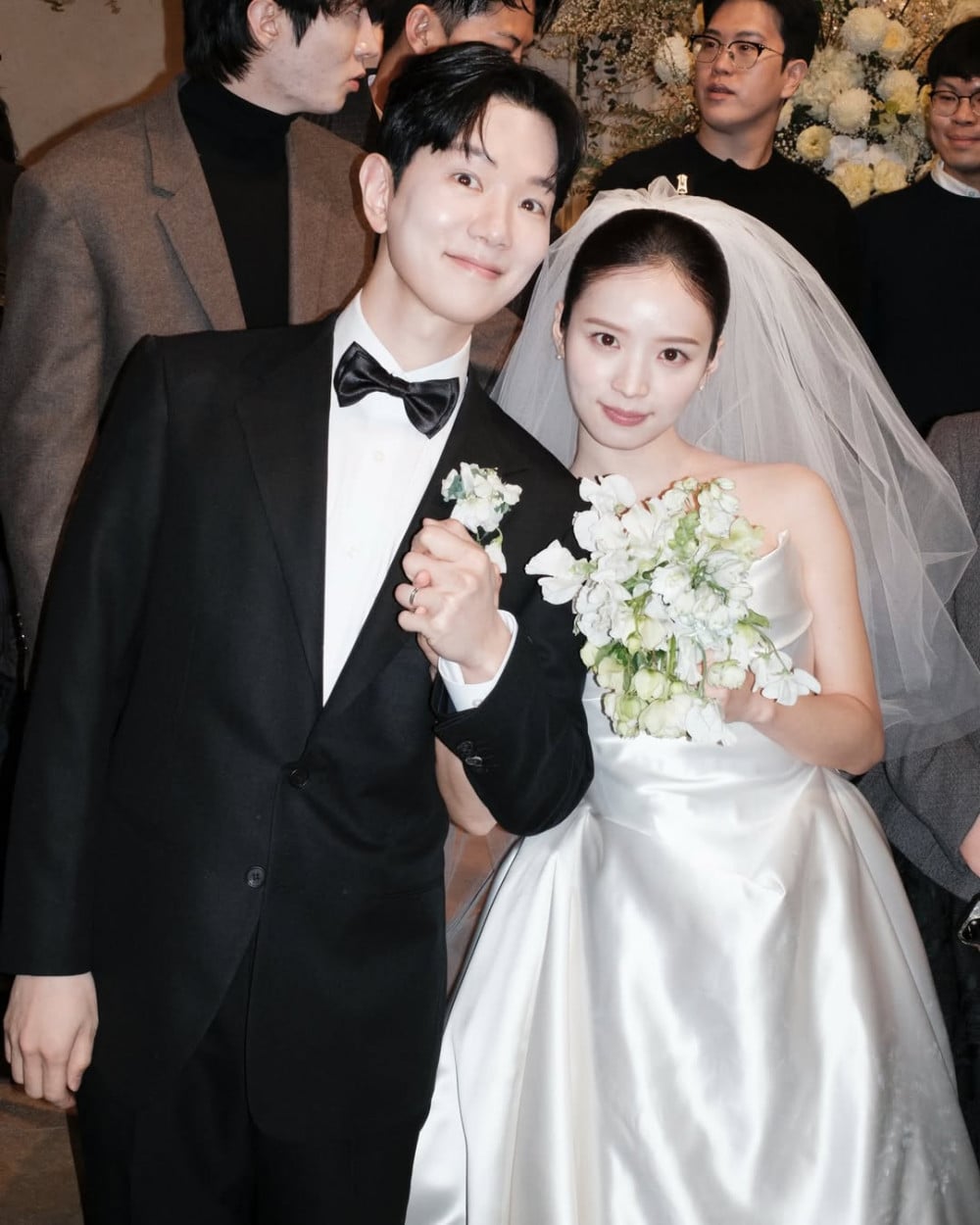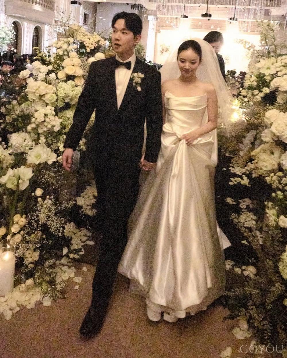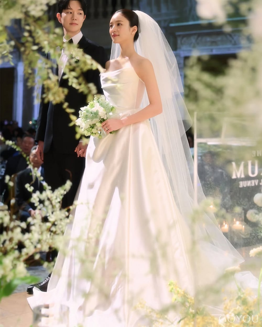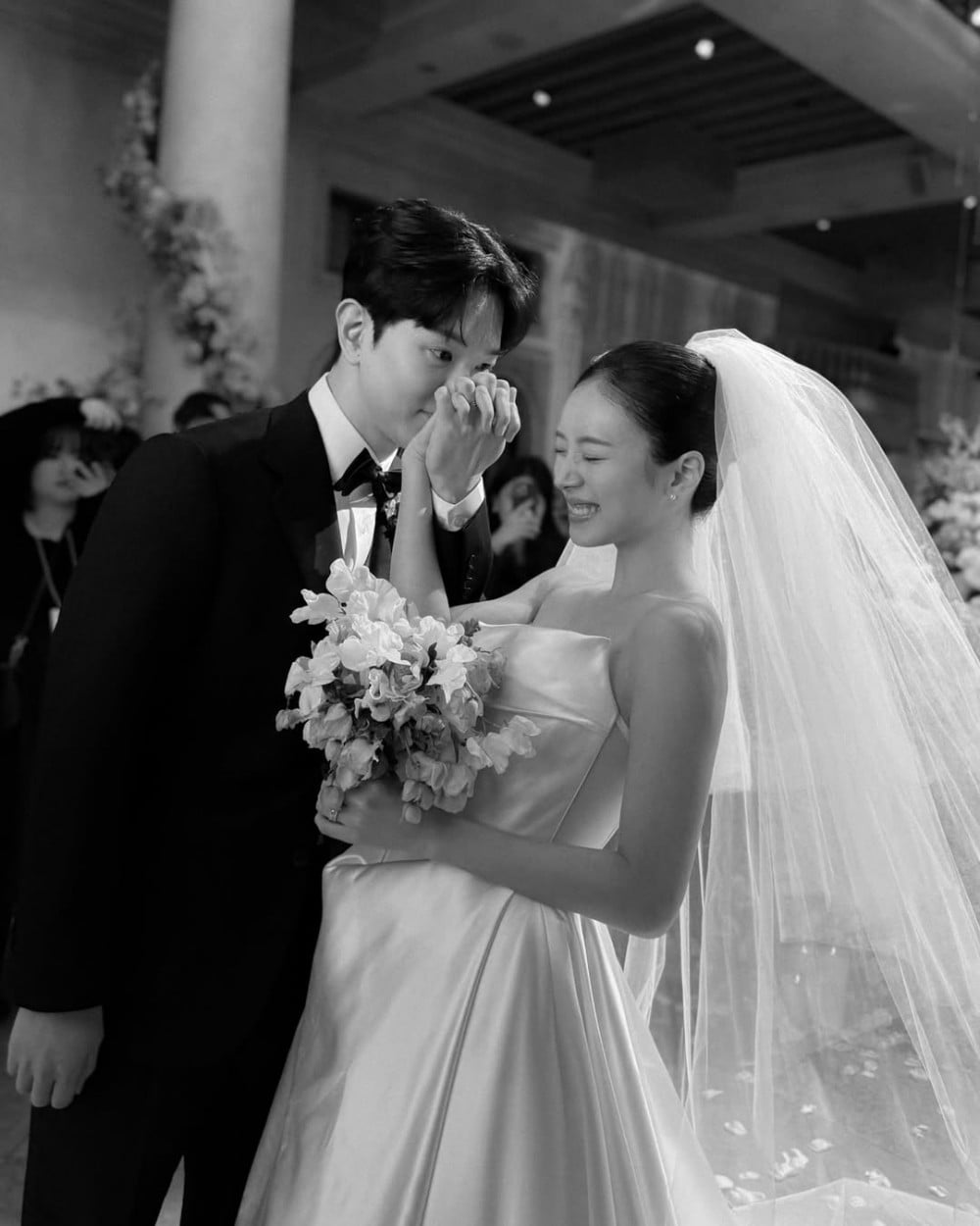 In her Instagram photos, Kim Ji Young stands at the center of a wedding venue filled with abundant floral decorations, completing an elegant mood with a pure white dress and veil. She is seen smiling brightly while holding her bouquet with both hands, and the silky texture of the dress along with the clean tube top line adds to the neat atmosphere.