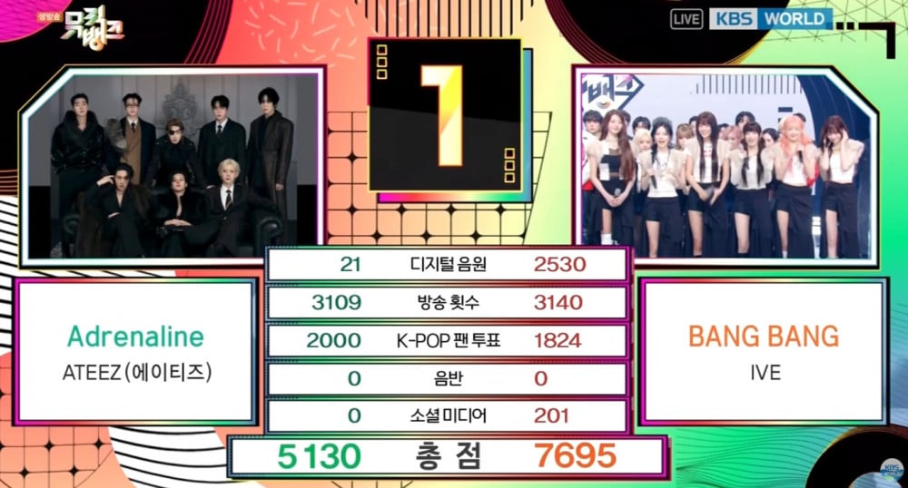 On the February 27th broadcast, IVE faced off against ATEEZ as the number-one contenders. IVE’s hit “BANG BANG” scored a total of 7,695 points, surpassing ATEEZ’s “Adrenaline,” which earned 5,130 points, to take first place.