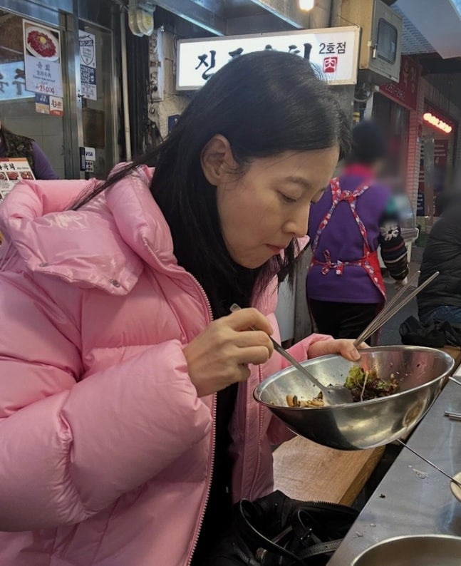 Dressed comfortably in a bright pink padded jacket paired with a black turtleneck, she explored the market freely. She was seen enjoying signature foods such as handmade kalguksu noodles, bibimbap served in a large bowl, and hotteok street snacks in a paper cup — showing an unpretentious charm.