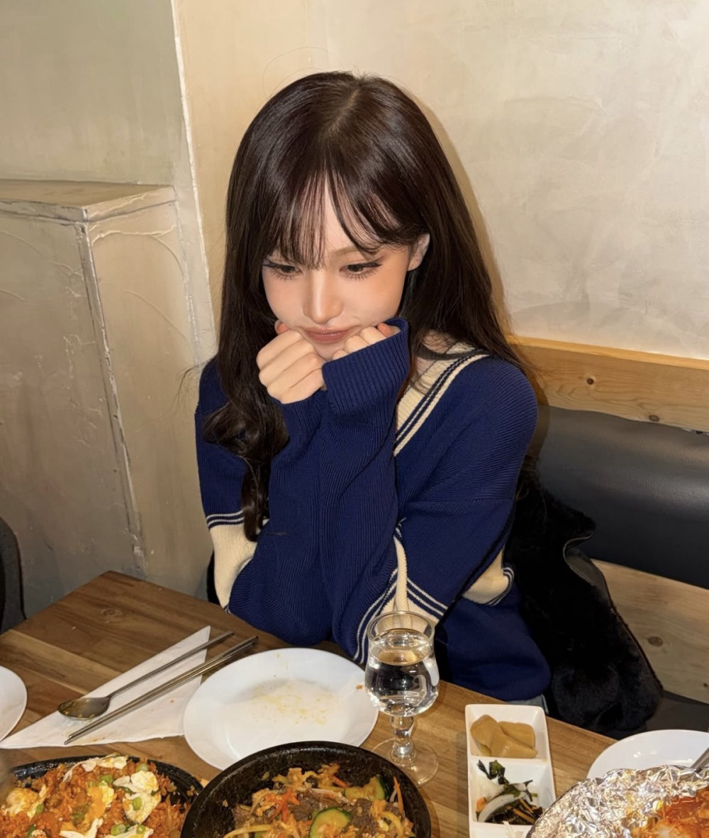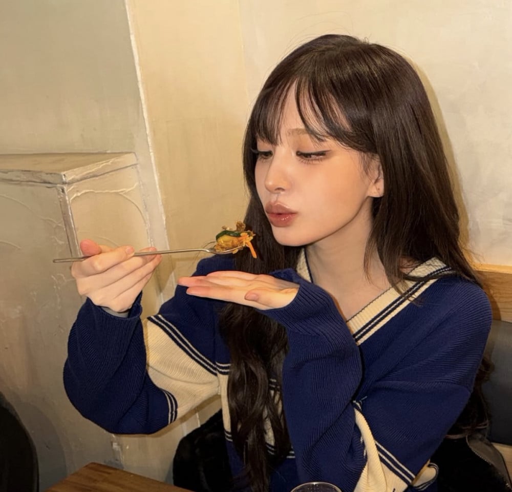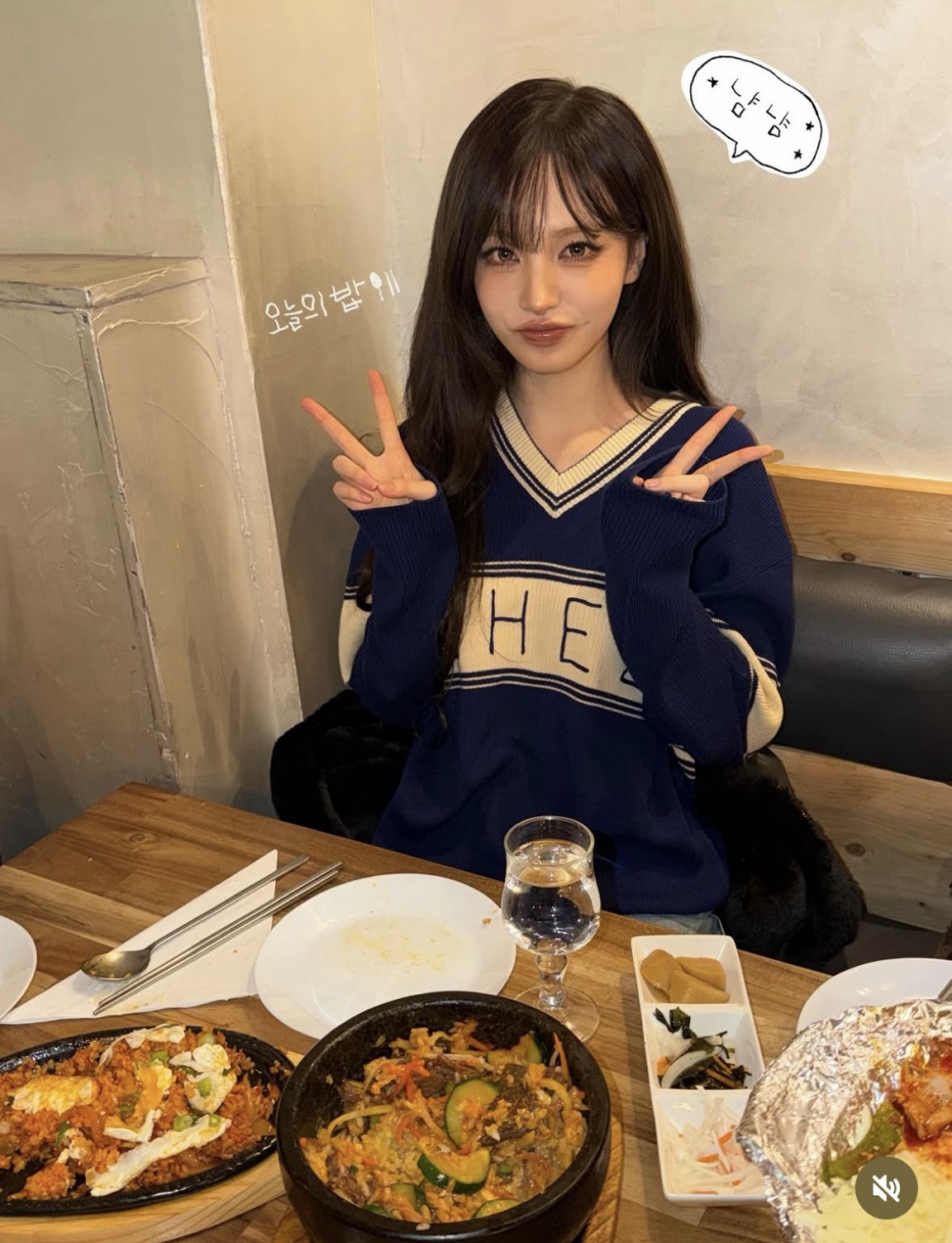 On February 1st KST, Liz posted several photos on her social media along with the short caption, “Valentino girl’s dinner.” In the photos, she is seen posing cutely with both hands gathered near her face in front of a table set with kimchi fried rice and stone pot bibimbap. She also decorated the images with what appears to be her own handwriting that reads “Today’s meal,” and drew attention by sharing moments of herself enjoying a relaxed meal in a comfortable setting.