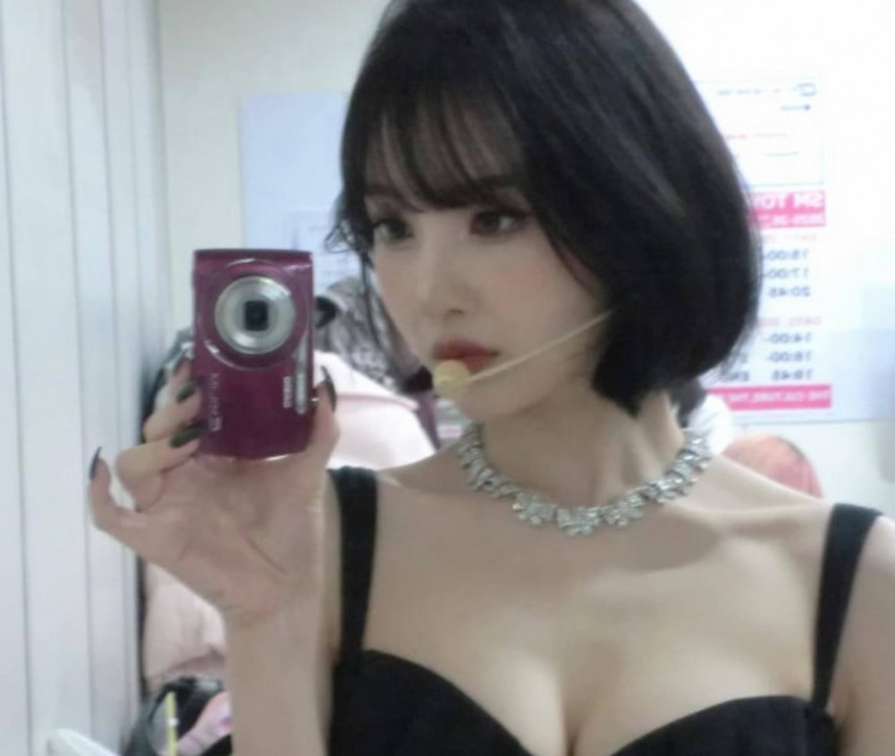 In the images, she is seen wearing a black top while taking a mirror selfie with a digital camera, capturing her reflection with a casual yet stylish vibe.