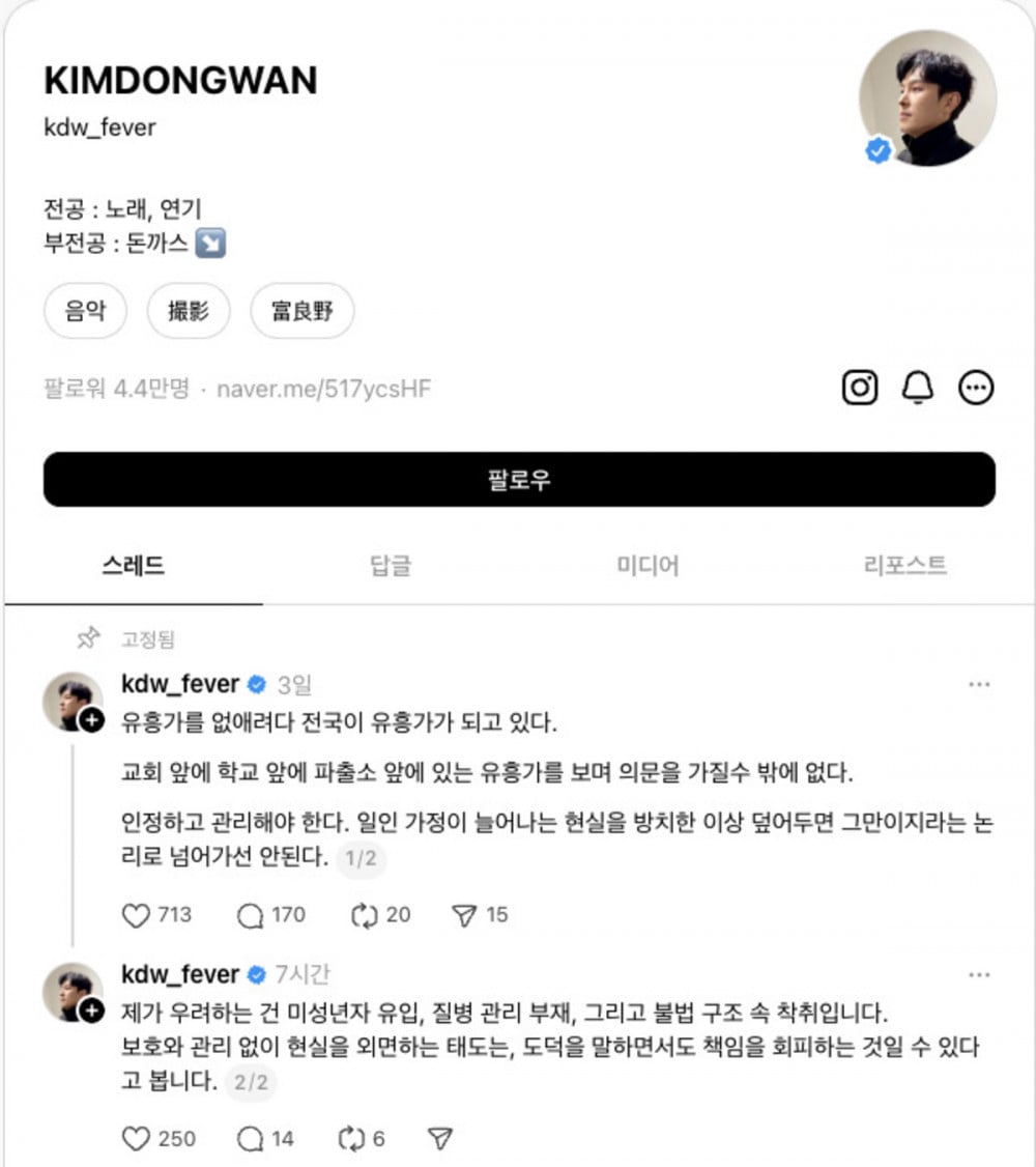 His remarks left many fans stunned. Online reactions included comments such as, “Wow,” “He’s really gone too far,” “This is the worst nonsense I’ve ever seen,” “Can’t he change starting this new year?” and “This is dizzying.” Although Kim later deleted the posts and reportedly closed his Threads account, traces of the discussion remain accessible through search engines.