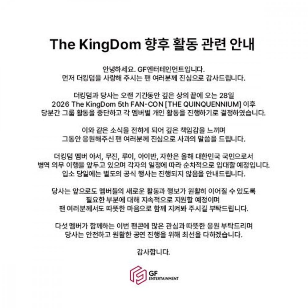 GF Entertainment announced that The KingDom (KINGDOM) will pause group activities following their upcoming fan concert, with the remaining members set to fulfill their mandatory military service within the year.