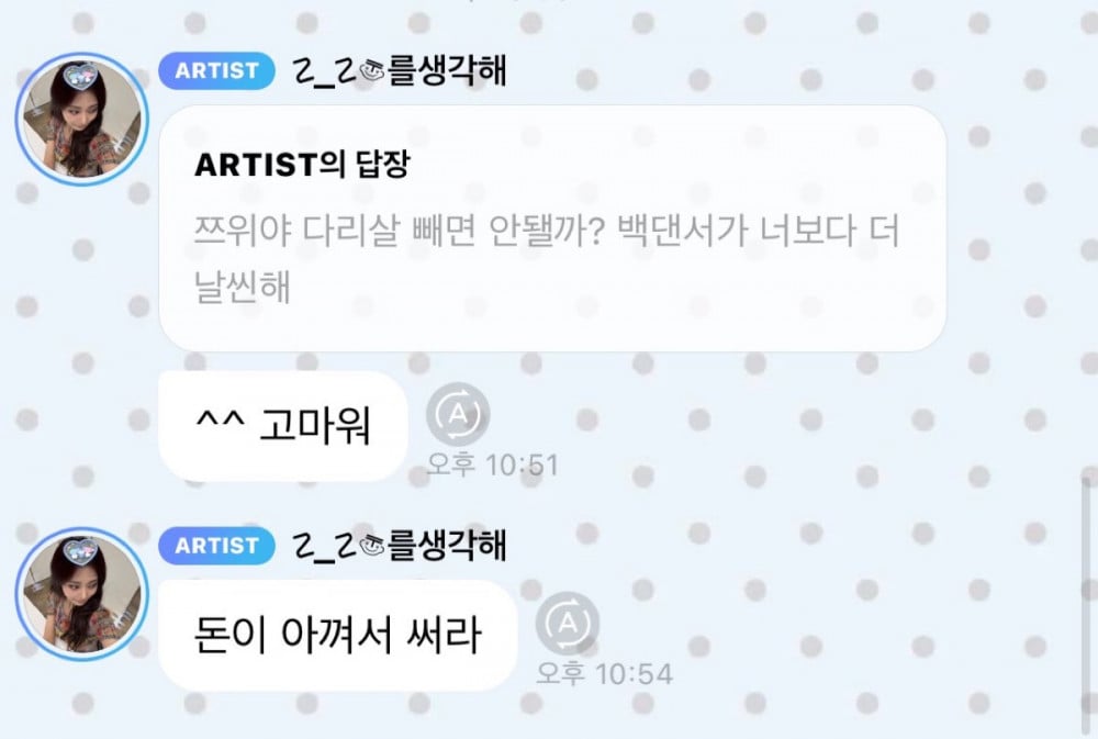 On February 16th KST, a netizen sent Tzuyu a message through the paid fan communication app “Bubble,” writing, “Can’t you lose some leg weight? The backup dancer is slimmer than you.”