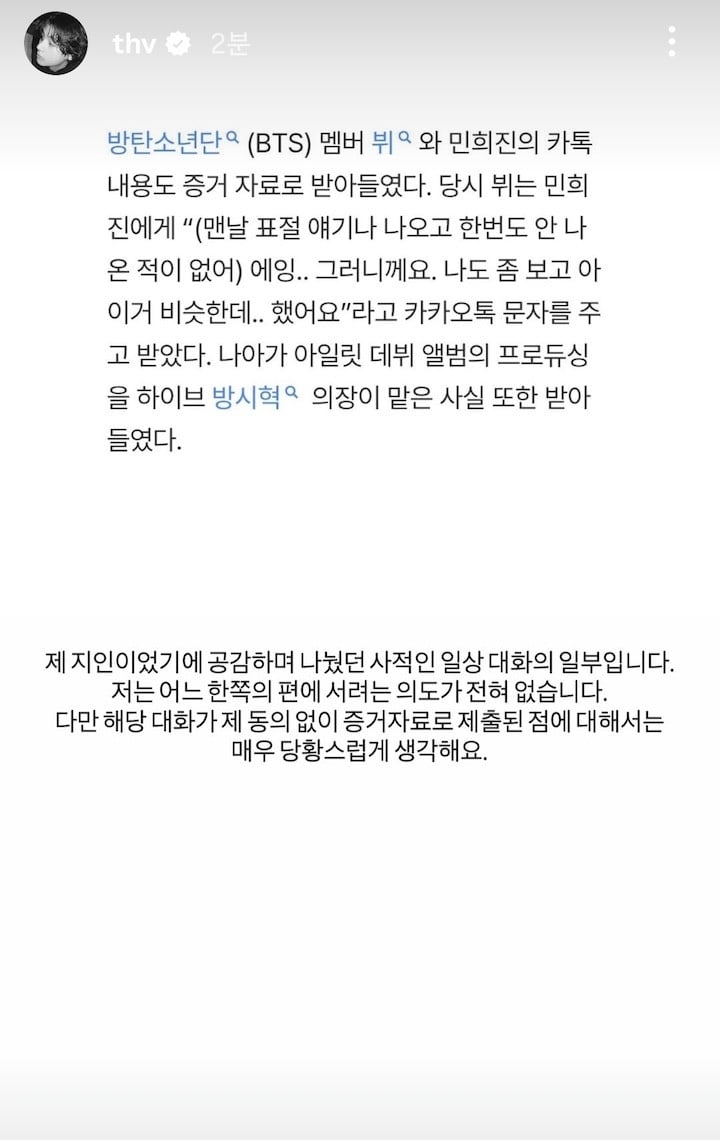 In response to the realization that his KakaoTalk messages had been submitted to the court as evidence, V wrote via his Instagram story on this day,