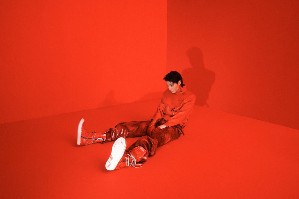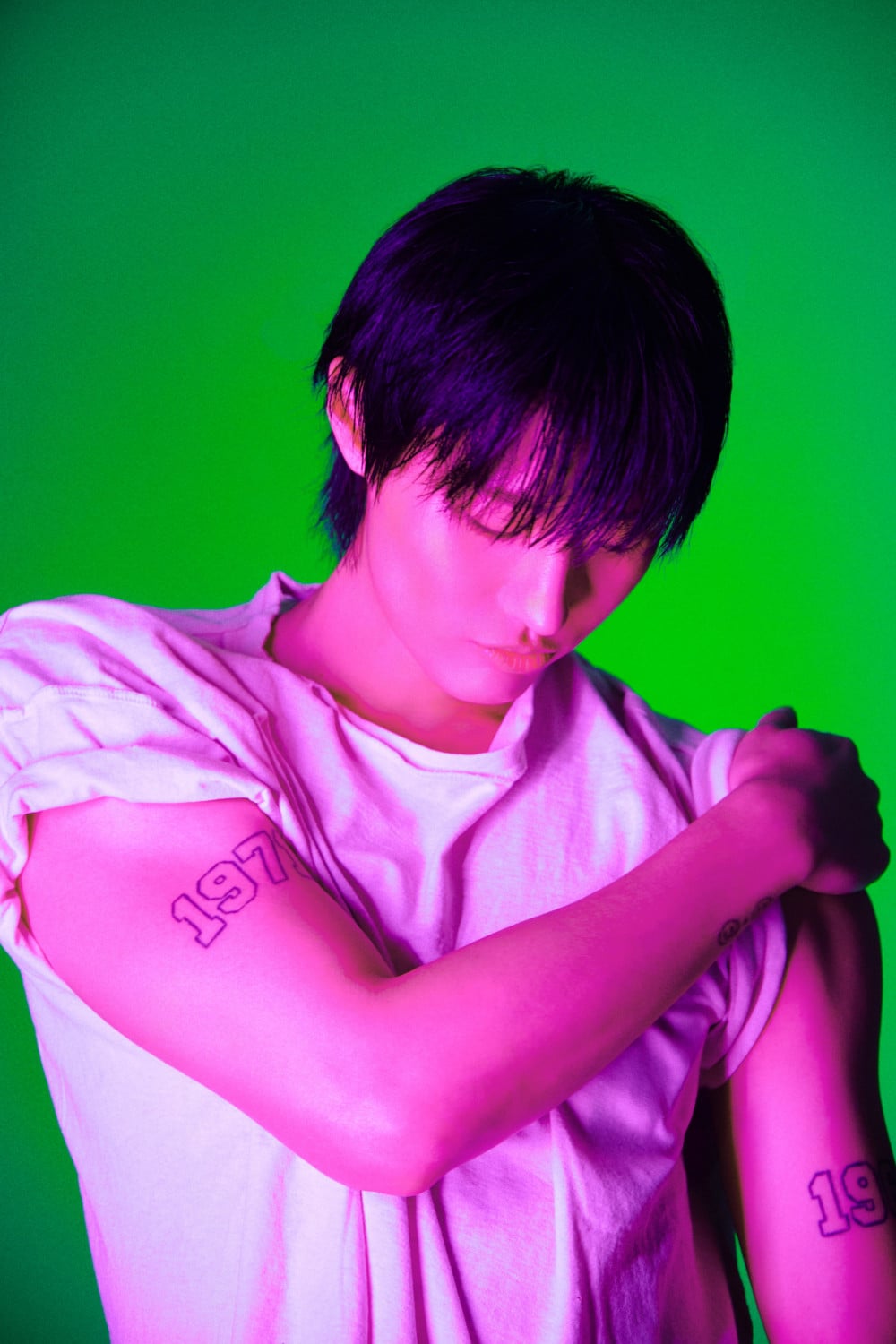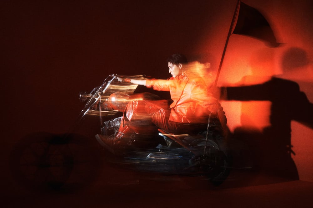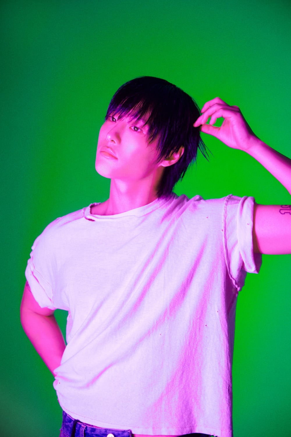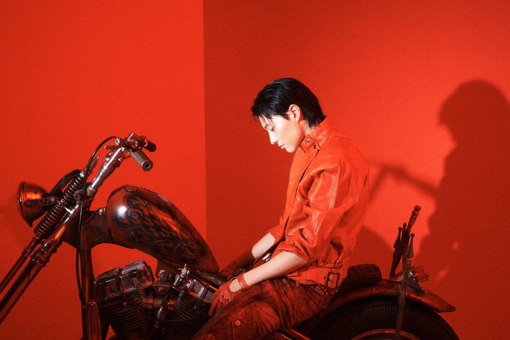 In these images, WOODZ exudes chic and charismatic sides that match the bold contrast of the neon lights.